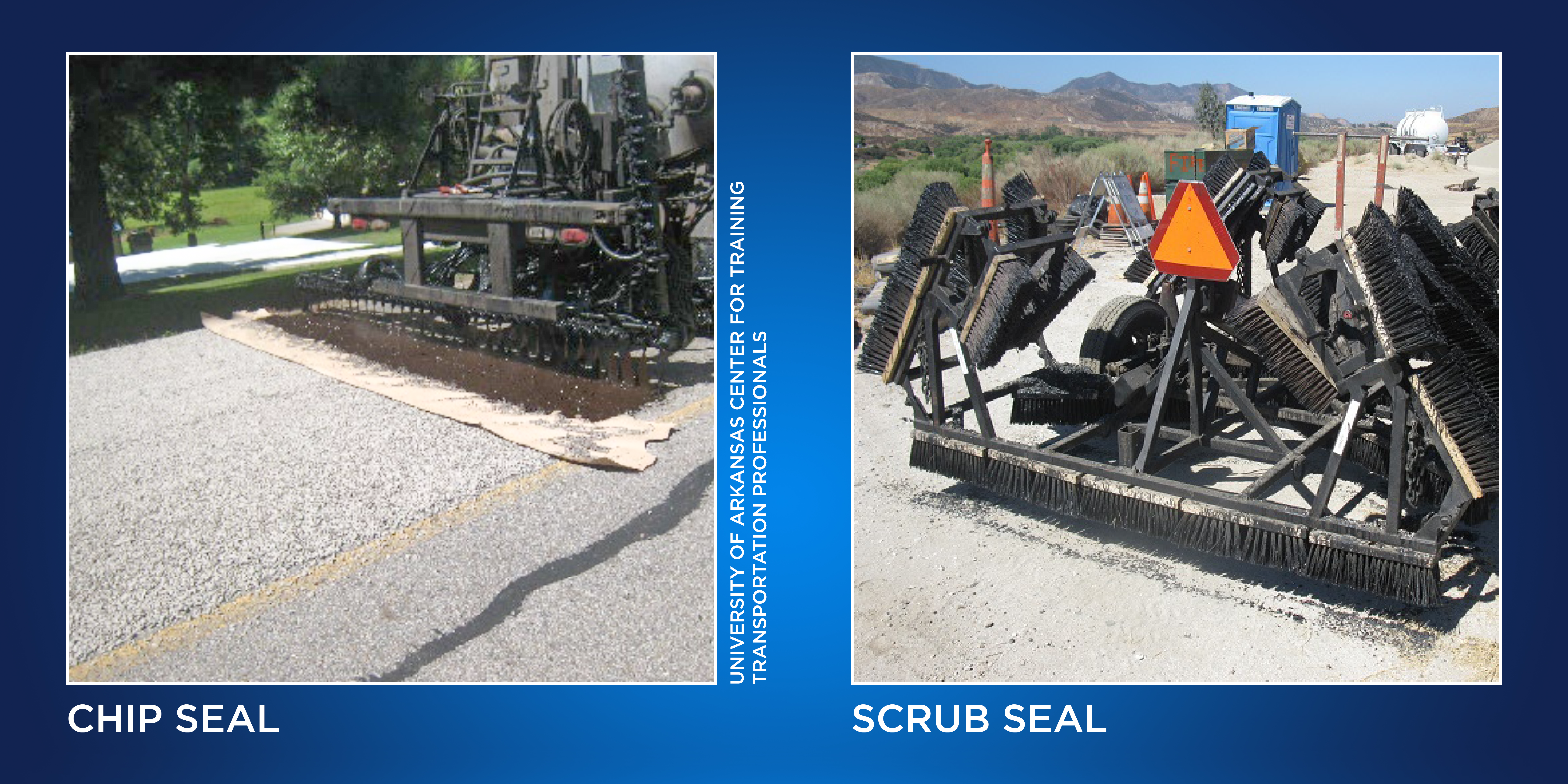 Scrub seal: The scrub seal method is similar to the chip seal treatment. A viscous, asphalt-like liquid is applied to the surface, but the difference occurs with the “scrub.” A squeegee-like series of brushes working from different angles is pulled behind the distributor vehicle to ensure the liquid asphalt is sealing all cracks thoroughly.
