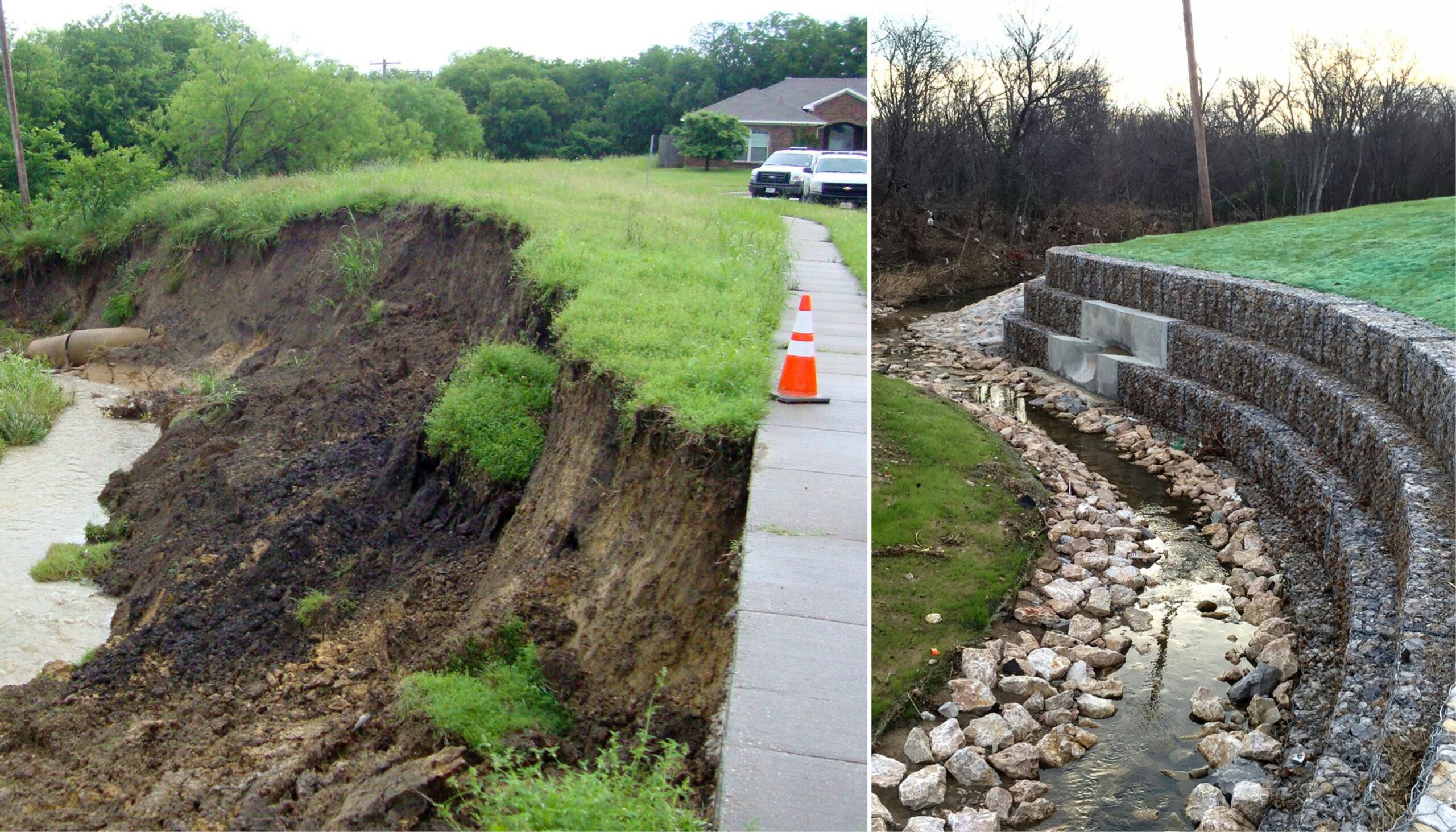 Hard-armor solutions to protect against future erosion can include gabions, precast block retaining walls, rock riprap and rock chutes for channel grade stabilization.